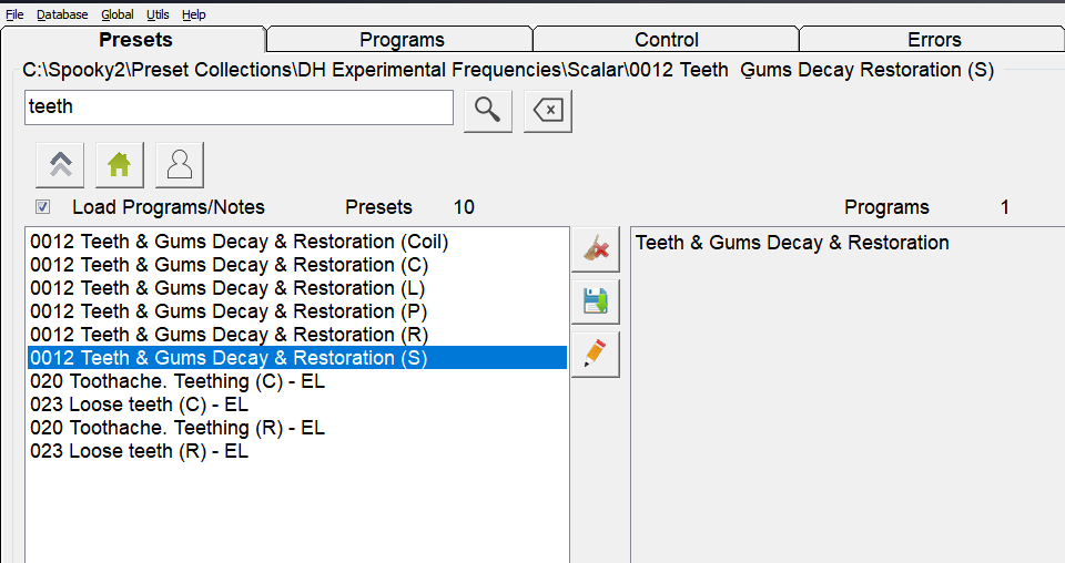 • Sélection du programme : Dans le logiciel Spooky2, accédez à la section Fréquences expérimentales DH et sélectionnez 0012 Carie et restauration des dents et des gencives (S).
