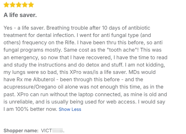 Oui, une bouée de sauvetage. J’avais des difficultés respiratoires et, après 10 jours de traitement antibiotique pour une infection dentaire, j’ai opté pour une fréquence de type antifongique (et autres) sur le Rife. J’ai déjà vécu ça, donc des programmes antifongiques principalement. Même prix que pour le « mal de dents » ! C’était une urgence, alors maintenant que je suis rétabli, j’ai le temps de lire et d’étudier les instructions, de faire une détox et tout ça. Je ne plaisante pas, mes poumons étaient tellement abîmés que ce XPro était/est une bouée de sauvetage. Les médecins m’auraient prescrit de l’albutérol – j’ai déjà vécu ça – et l’acupression et l’huile d’origan seules n’ont pas suffi cette fois, comme par le passé. XPro peut fonctionner sans ordinateur portable connecté, car le mien est vieux et peu fiable, et il est généralement utilisé pour accéder à Internet. Je dirais que je vais 100 % mieux maintenant.