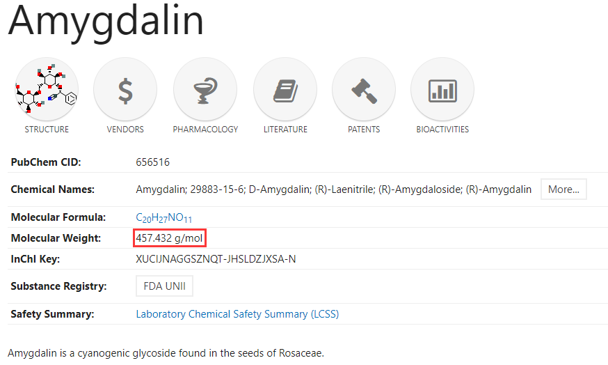 Vous pouvez trouver le poids moléculaire sur ce site Web : https://www.ncbi.nlm.nih.gov/pccompound/. Par exemple, le poids moléculaire de la vitamine B17 est de 457,432 g/mole.