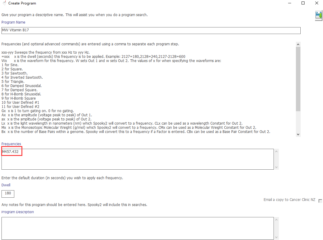 2. Saisissez les informations : Nom du programme, fréquences et description du programme. Notez que dans le volet des fréquences (Frequencies), vous devez d’abord taper la lettre « M », puis entrer le poids moléculaire après celui-ci, par exemple : « M457.432 ».