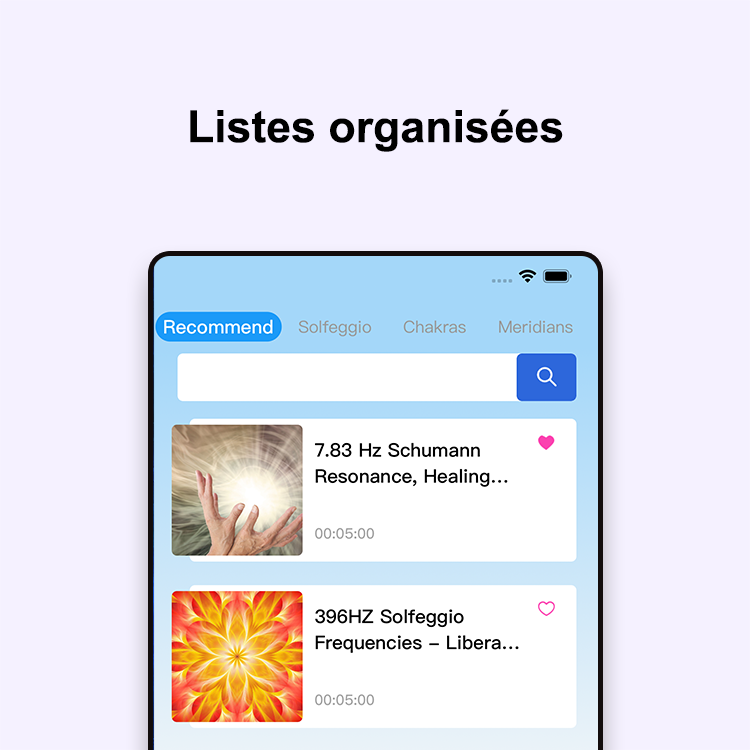 Frequency Heals vous permet de naviguer facilement à travers une variété de musiques de guérison. Nous avons organisé quelques listes de lecture pour vous permettre d’accéder sans effort aux audios les plus populaires. Vous pouvez également rechercher le morceau idéal qui résonne en vous.