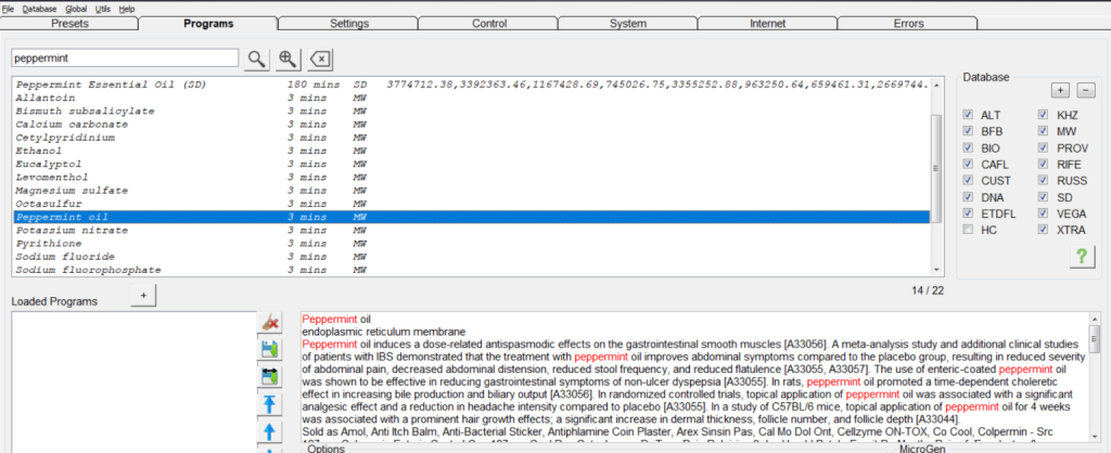 Vous pouvez également utiliser le mode scalaire Rife en exécutant les fréquences appropriées pour l’huile essentielle de menthe poivrée afin de profiter de ses bienfaits. Ouvrez simplement le logiciel Spooky2, cliquez sur l’onglet Programmes et recherchez « menthe poivrée », vous accéderez alors aux fréquences souhaitées.