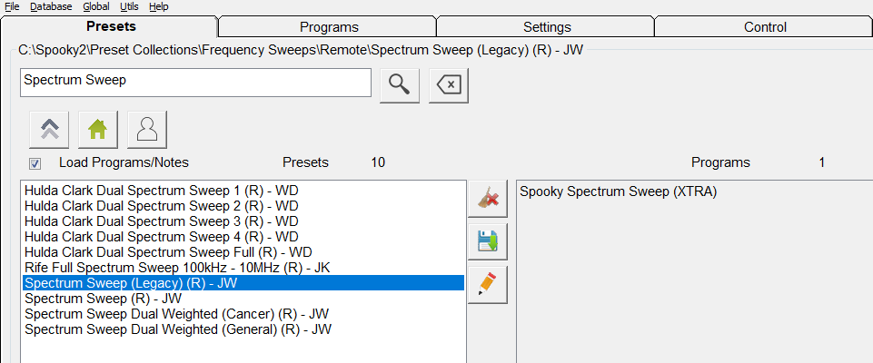 - Sélection du programme de fréquences : Suzi a ouvert le logiciel Spooky2 et sélectionné le programme suivant : Collections de préréglages > Balayages de fréquences > À distance > Balayage de spectre (Héritage) (R) – JV.