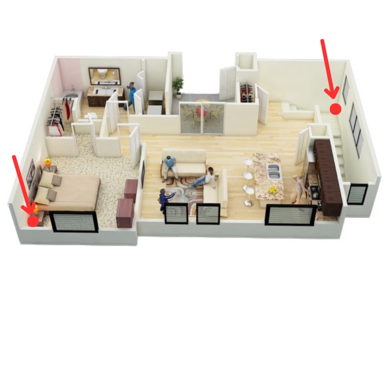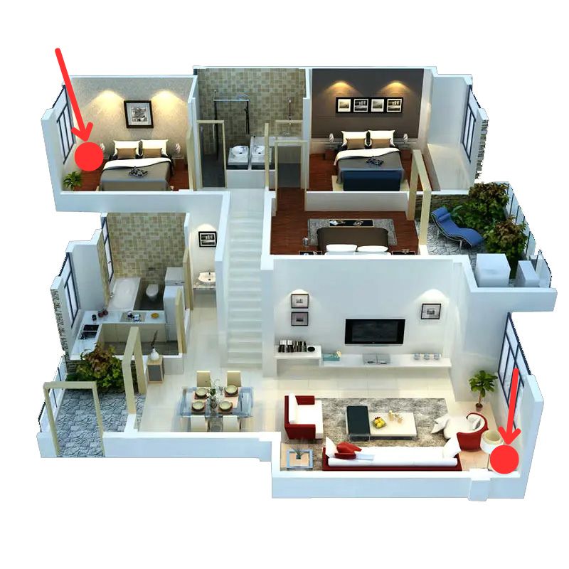 Placez les boîtes scalaires dans les coins sélectionnés de la maison et connectez-les avec le câble de liaison. (Pour une maison à deux étages, vous pouvez placer une boîte au rez-de-chaussée et l’autre au dernier étage.)