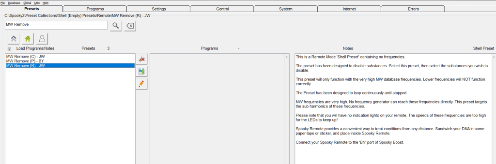 Si un produit de contraste a été utilisé lors de votre scan, vous pouvez soutenir votre corps en exécutant une fréquence de détoxification correspondante. Dans le logiciel Spooky2, allez dans l’onglet «Preset» et suivez ce chemin : Preset Collections > Shell (Empty) Presets > Remote > MW Remove (R) – JW.