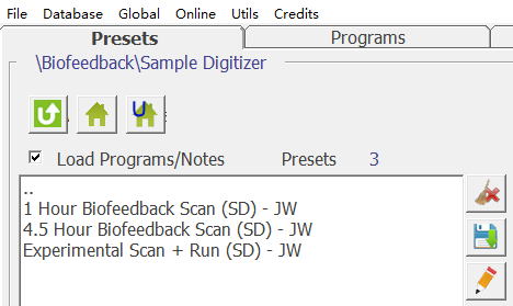 Etape 2 : Lancez le logiciel Spooky2. Allez dans l’onglet «Presets», sélectionnez >Biofeedback, Sample Digitizer. Vous pouvez voir qu’il y a trois préréglages. Les deux premiers sont pour le scan Biofeedback du Sample Digitizer. Le troisième préréglage combine le scan et le traitement, ce qui est une fonction expérimentale. Pour des traitements efficaces, nous recommandons d’utiliser les modes Plasma, Contact et Remote pour analyser les résultats de la numérisation. Vous pouvez choisir les préréglages Scan de biofeedback (SD) – JW d’une heure ou Scan de biofeedback (SD) – JW de 4,5 heures pour effectuer un scan simple. Une durée de scan plus longue améliore la précision des résultats.