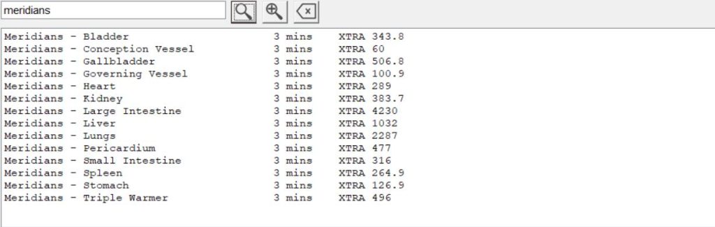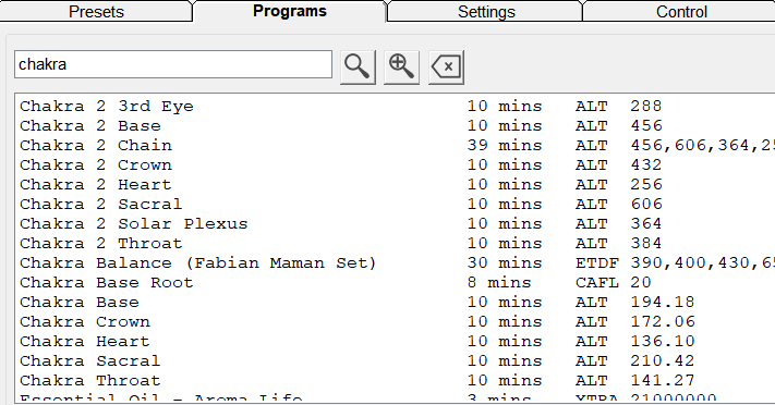 Vérifiez le logiciel Spooky2, depuis l’onglet « Presets » sous « Shell (Empty) Presets\Scalar », cliquez sur « Spooky Scalar General (SS) -JW », allez dans l’onglet des programmes (« Programs ») et cherchez les mots clés « chakra », « meridians ». Voici les fréquences que vous pouvez utiliser avec le Spooky2 Scalar.