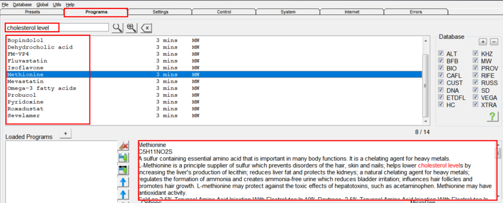 Étape 2 : Allez dans l’onglet «Programs», recherchez «cholesterol level» (taux de cholestérol) pour les programmes afférents, et choisissez celui ou ceux que vous désirez selon la description ci-dessous.