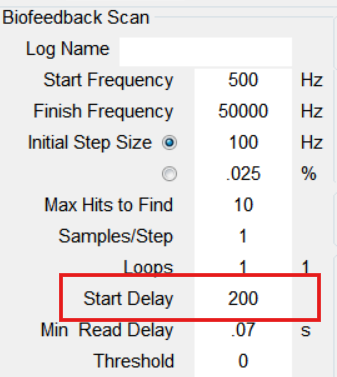 R Vous pouvez retarder le balayage en réglant la valeur « Start Delay » (Délai de démarrage) sur 2000 ou plus dans la section « Biofeedback Scan » (Scan de biofeedback) sous l'onglet « Control ». Cela vous laissera le temps de vous installer avant que le processus de scan proprement dit ne commence.