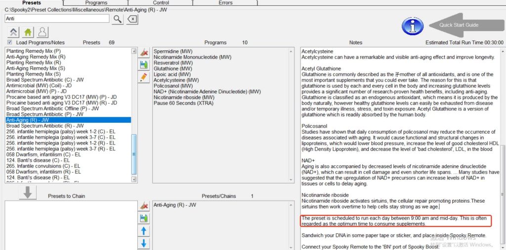Les programmes d’ADN utilisent des fréquences d’ADN spécifiques très élevées pour stimuler la réparation et la guérison de l’ADN, contrairement aux fréquences Rife qui visent plutôt à tuer les agents pathogènes et à guérir les cellules et les structures. Vous pouvez trouver des notes sur les abréviations des bases en cliquant sur le point d’interrogation sous l’onglet des programmes dans le logiciel spooky2.