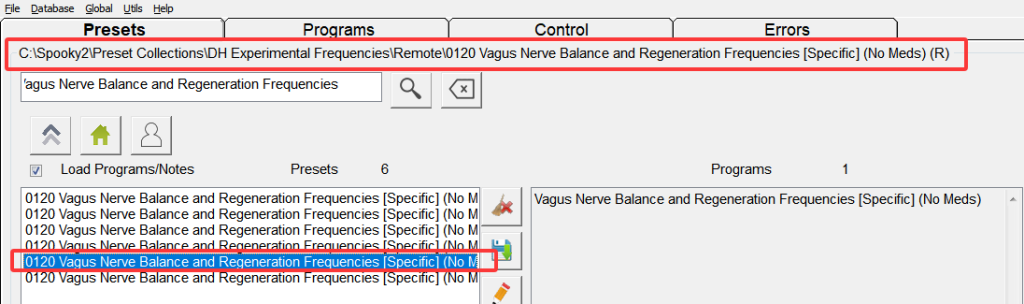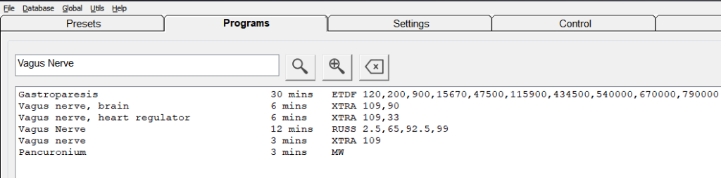 Spooky2 offre un programme prédéfini spécifiquement pour la santé du nerf vague : Vagus Nerve Balance and Regeneration Frequencies [Specific] (No Meds). Pour l’utiliser :