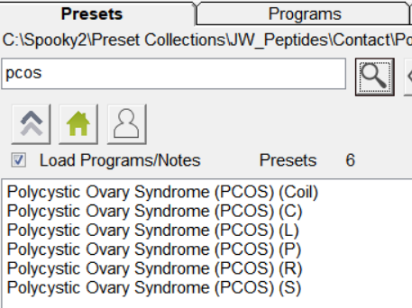 Pour le SOPK, il existe une série de préréglages conçus pour différents modes d'application afin de cibler ce syndrome. Ils font partie de notre bibliothèque de préréglages peptidiques et sont plus efficaces dans les traitements ciblés. (Pour en savoir plus sur les programmes peptidiques, cliquez ici : https://www.spooky2.fr/prereglages-peptidiques-revolutionner-la-guerison-au-niveau-moleculaire/ ) Effectuez une recherche dans l'onglet « Presets » et sélectionnez le mode que vous souhaitez utiliser.