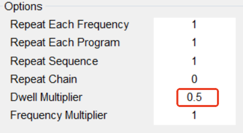 - «Dwell Multiplier» : par défaut = 1 (180 s par fréquence). Le régler sur 0,5 (90 s) divise le temps par deux. Les utilisateurs avancés utilisent parfois 0,003 pour des sessions encore plus rapides, tout en maintenant les résultats.