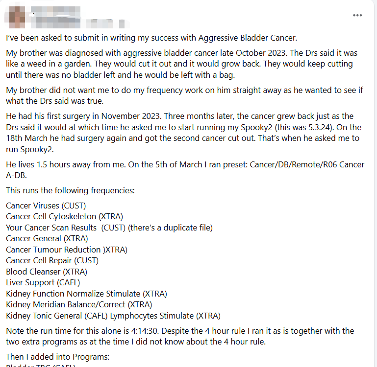 Il a subi sa première opération en novembre 2023. Trois mois plus tard, le cancer est revenu exactement comme les médecins l’avaient annoncé. C’est à ce moment-là qu’il m’a demandé de commencer à utiliser mon Spooky2 (le 5 mars 2024). Le 18 mars, il a subi une deuxième opération pour retirer à nouveau la tumeur. C’est alors qu’il m’a officiellement demandé de lancer Spooky2.