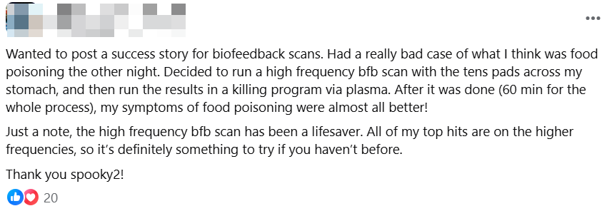 Je voulais partager une histoire de réussite avec les scans biofeedback. J’ai eu récemment un très mauvais épisode, que je pense être une intoxication alimentaire. J’ai décidé de lancer un scan BFB haute fréquence avec les électrodes TENS placées sur mon estomac, puis de faire tourner les résultats dans un programme de destruction via le plasma. Une fois terminé (60 minutes pour tout le processus), mes symptômes d’intoxication alimentaire avaient presque totalement disparu !