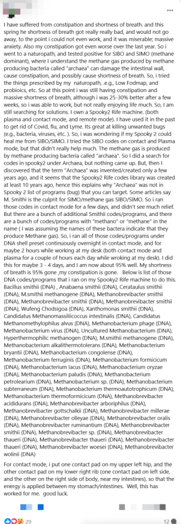Certains articles indiquent que M. smithii est le coupable du SIMO/SIBO à méthane. J’ai donc exécuté ces programmes en mode contact pendant quelques jours, sans voir beaucoup de soulagement. Cependant, j’ai trouvé d’autres programmes ciblant Smithii et des programmes avec « methano » ou « methane » dans le nom.