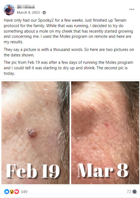 Nous avons notre Spooky2 depuis seulement quelques semaines. Nous venons tout juste de terminer le protocole « Terrain » pour la famille. Pendant ce temps, j’ai décidé d’agir sur un grain de beauté sur ma joue, qui avait récemment grandi et m’inquiétait. J’ai utilisé le programme « Moles » en mode Remote – et voici mes résultats.