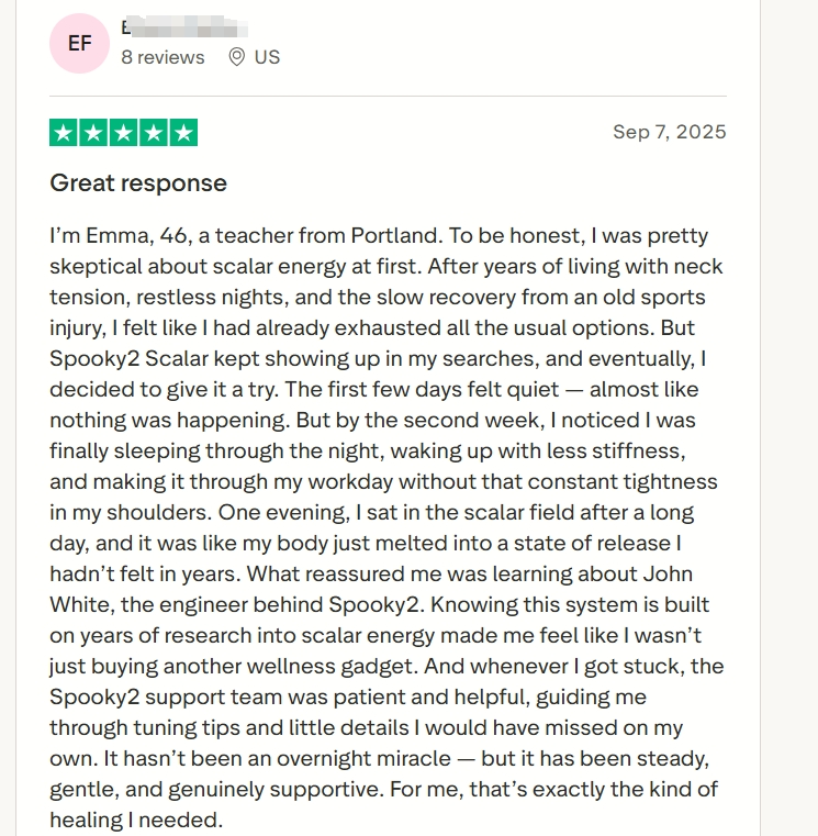 Ce qui m’a rassurée, c’est d’apprendre à connaître John White, l’ingénieur derrière Spooky2. Savoir que ce système repose sur des années de recherches sur l’énergie scalaire m’a donné le sentiment que je n’achetais pas simplement un gadget de bien-être de plus. Et chaque fois que je rencontrais une difficulté, l’équipe d’assistance Spooky2 s’est montrée patiente et serviable, me guidant à travers les conseils d’ajustement et les petits détails que j’aurais manqués toute seule.