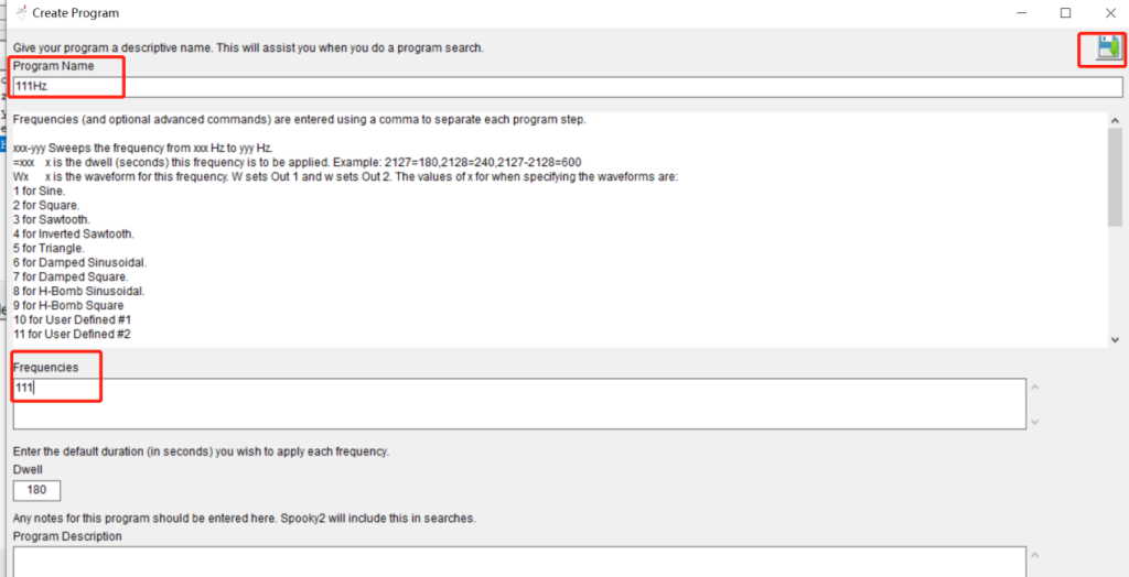 Ensuite, vous pouvez saisir le nom du programme, par exemple 111 Hz. Ensuite, tapez 111 dans le champ Fréquences et cliquez sur le bouton Enregistrer dans le coin supérieur droit.