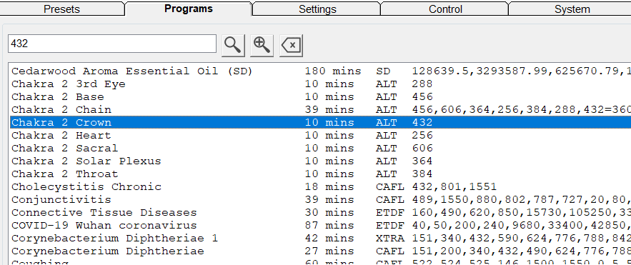 Ouvrir le logiciel Spooky2 et aller dans l’onglet « Presets ». Sous « \Shell (Empty) Presets\Scalar », cliquez sur « Spooky Scalar General (SS)-JW », puis allez dans l’onglet « Programs » et recherchez « 432 ».